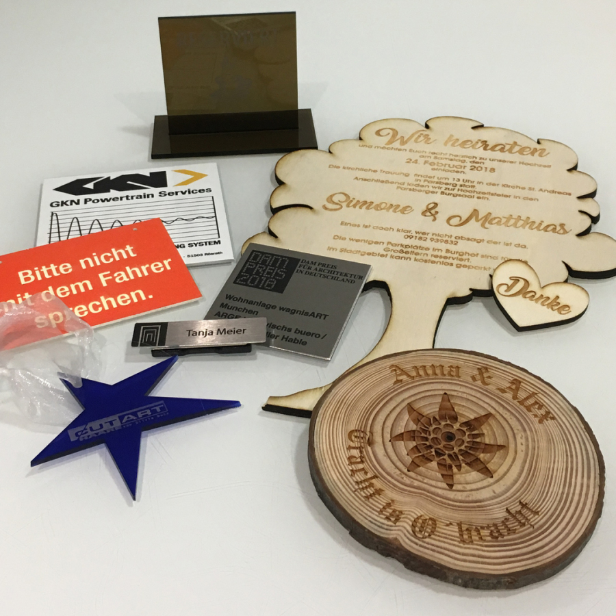 Wir veredeln ihre persönlichen Einzelstücke mit Namen und Fotos. Mit unseren verschiedenen Laseranwendungen gravieren wir gestochen scharf und dauerhaft nahezu alle Materialien, wie Edelstahl, Holz, Stein, Glas, Leder, Acrylglas. Sogar Lebensmitteln verpassen wir mit dem Laserstrahl flotte Sprüche! Mit dieser Technik lassen sich Kugelschreiber, Handys, Geldbörsen, Laptops und sogar die Lieblingsjeans personalisieren. Sie sehen also: es sind der Phantasie kaum Grenzen gesetzt, und das Ergebnis ist in jedem Fall ein echter Hingucker.